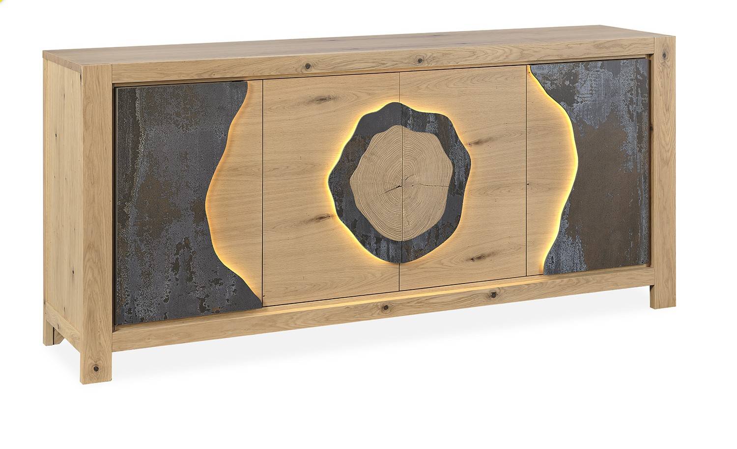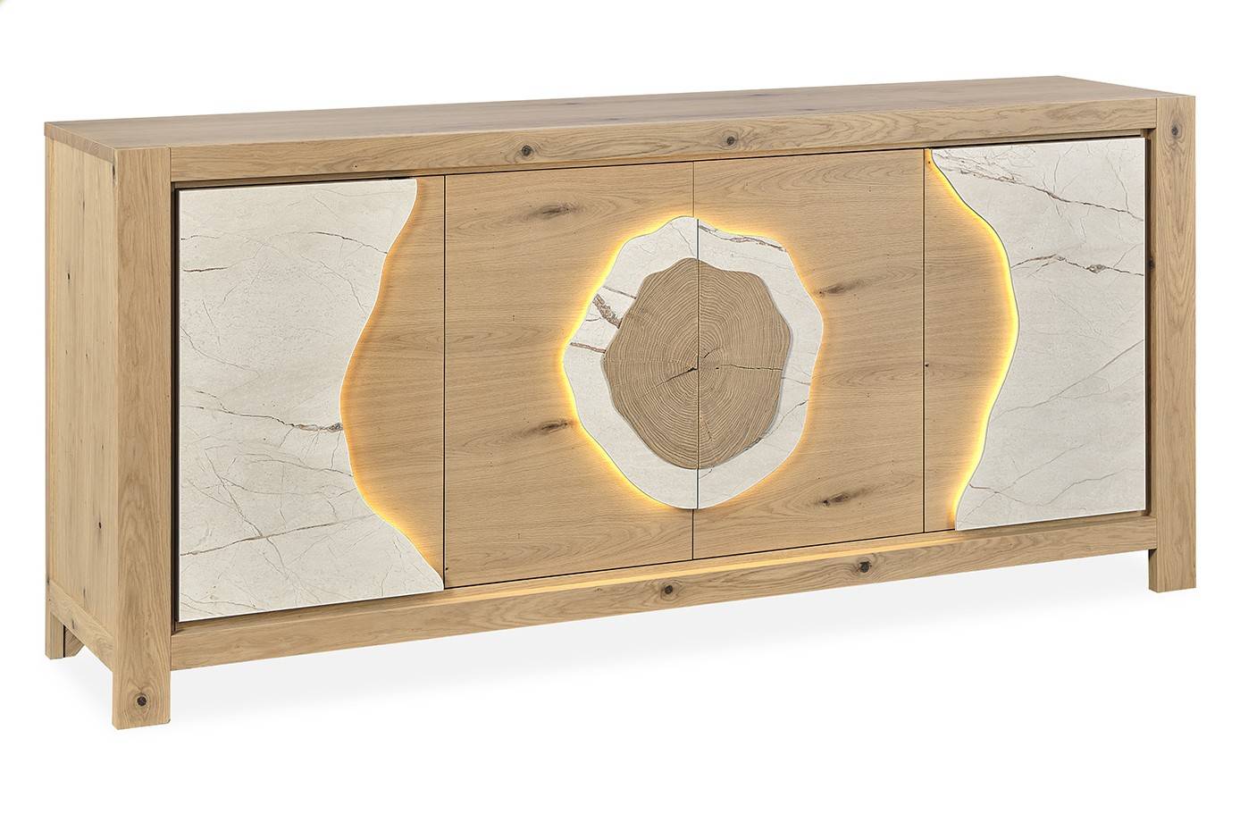 Placage chêne, céramique beige veinée ou Dekton brun panaché.
