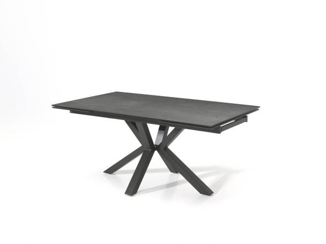 Plateau céramique collée sur verre.Pieds métal finition époxy gris anthracite. 2 allonges de 50 cm